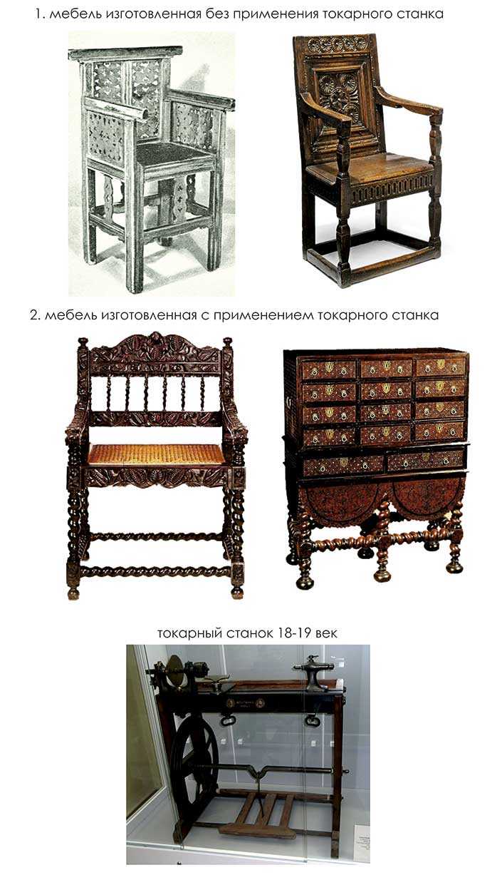 Токарный станок – это станок для вытачивания деталей из дерева или других материалов, основанный на принципе вращения. При производстве мебели из дерева применяется для вытачивания балясин и ножек округлой формы. До этого изобретения столярные работу по дереву производились, в основном вручную. Сведения о станках, похожих по смыслу на токарный (т.е. на основе вращения) встречаются еще до нашей эры. Конечно, тогда они были не совершенны. Точность детали зависела от мастерства изготовителя, т.к. резец перемещался вручную. После изобретения токарного станка с автоматическим вращением резца изменилось навсегда не только производство мебели, но и другие сферы производства и промышленности. Т.к. токарный станок является родоначальником многих станков для обработки металла и других материалов. С этого времени столярная мастерская получила новый универсальный инструмент для вытачивания балясин любой формы. Как правило, это ножки. Посмотрите на картинки. На двух первых картинках изображена резная деревянная мебель с множеством деталей. На последних - тоже резная мебель с деталями. В чем отличие? Балясины. Таким образом, мы может понять, что первые изделия были, скорее всего, изготовлены до 17 века, и мастер вырезал все узоры вручную на плоских деталях. Мебель из дерева на двух последних картинка была изготовлена в 17 веке или позже, т.к. изготовление балясин и ножек такой формы возможно только на токарном станке. Кстати, по этим приметам антиквары без труда узнают годы производства мебели. Сейчас мебельное и производство использует различные токарные станки. Столярные работы по дереву стали быстрее и проще. Если раньше такая мебель украшала дворцы и усадьбы, то сейчас заказать деревянную мебель и столярные работы в мастерской может любой желающий.