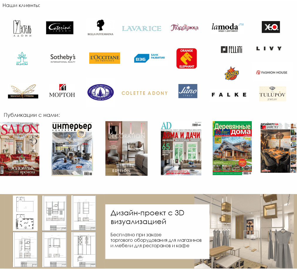 Мы много лет производим мебель по индивидуальным проектам и торговое оборудование на заказ для магазинов одежды, обуви, белья, ювелирных бутиков, косметики, продуктов питания, сантехники и многого другого. Компания ГЛЭД производит торговое оборудование из ЛДСП, ДСП, пластика, окрашенного МДФ, массива дерева с использованием стекла, металлических конструкций, нестандартных материалов по желанию заказчика. Кассовые столы на заказ, островное оборудование, пристенные панели из ЛДСП для одежды и белья, стеллажи по индивидуальным размерам, витрины, подиумы для манекенов на заказ, полки, стойки, зеркала и тд. Практически во всех торговых центрах Москвы и крупных городах России есть торговое оборудование на заказ нашего производства.